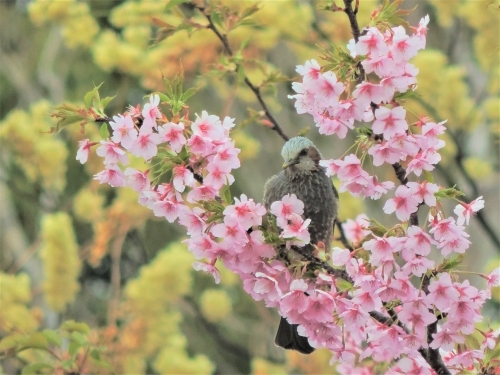 横山園地(志摩市)へ向かう道路沿いには、サクラの花で休憩中のヒヨドリがいました。スズメ目ヒヨドリ科ヒヨドリ属の鳥類で、日本国内では留鳥または漂鳥として見られます。全長約28㎝。花の蜜や果実が大好物ですが、虫や草の葉、芽なども食べ、「ヒヨ、ピーヨ」などと伸ばして鳴きます。