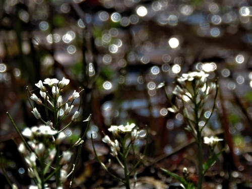 逆光に光り輝くのはタネツケバナです。横山園地(志摩市)創造の森で咲いていました。アブラナ目アブラナ科タネツケバナ属の越年草あるいは一年草で、日本全土に広く分布します。園地では、この季節になると小さな花々が咲き誇るようになり、タネツケバナも同様に自己主張しています。キラキラ光玉のような光が目にまぶしいです。