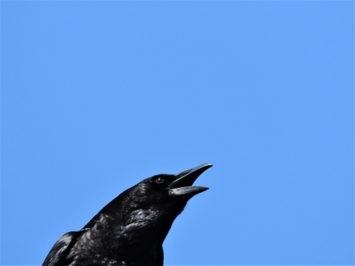 大空に向かって雄たけびをあげているのはハシボソガラスです。志摩市内の電柱で見かけました。鳥綱スズメ目カラス科カラス属に分類される大型鳥類で、日本のほぼ全域の平地から低山に分布する留鳥です。全長約50㎝。「ガーガー」と濁った声で鳴きます。青空に映える黒色がいい感じです。