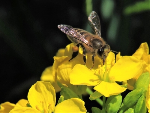 アブラナの華麗な花で花粉集めをしているのは二ホンミツバチです。志摩市内で出会いました。日本に古来から住んでいる日本固有の野生のミツバチで、北海道と沖縄を除く本州から四国、九州に生息します。二ホンミツバチは、世界中のミツバチの中でも、最も寒冷な土地に住むことができ、多湿な自然環境にも適応しているそうです。ちなみに、世界には9種類のミツバチがいます。