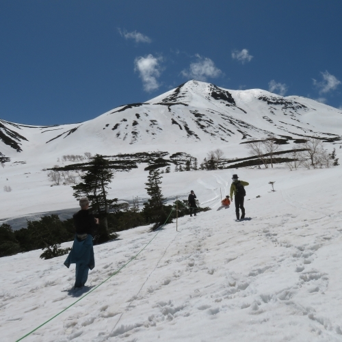 当日の午後には、バスの終点である位ヶ原山荘から先の位ヶ原まで徒歩で上がり、ロープ柵の設置状況等の確認も行いました。雪山はどこでも立ち入れてしまうため、ついついルートを外れてしまったり、雪の中から顔を出したハイマツ帯に踏み込んだりしてしまいがちですが、ライチョウや高山植物の生息環境を守るため「乗鞍岳 春山入山計画書」※を事前に確認し、注意事項やお願いを守るようにしてください。山の自然は貴重です。ただ楽しむだけでなく、環境に対して責任を持った楽しみ方をするようにしましょう。