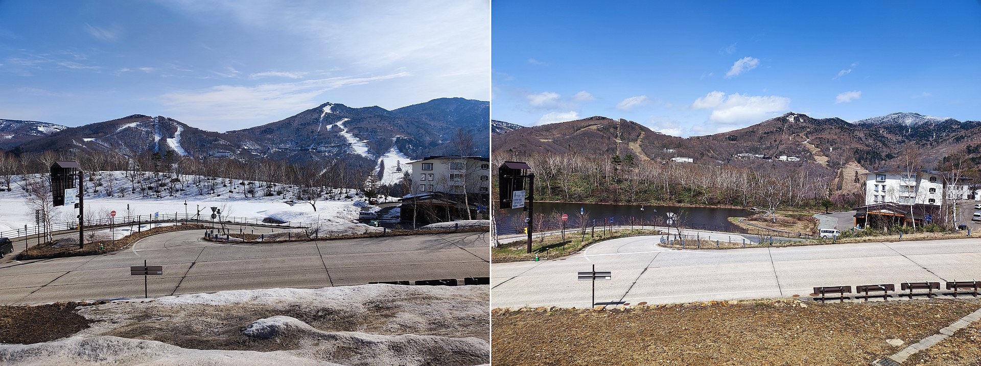 ■志賀高原管理官事務所の標高は約1,500mです。事務所の駐車スペースから見える東館山方面の雪は少なくなりました。撮影日は左は4月10日、右は5月7日。