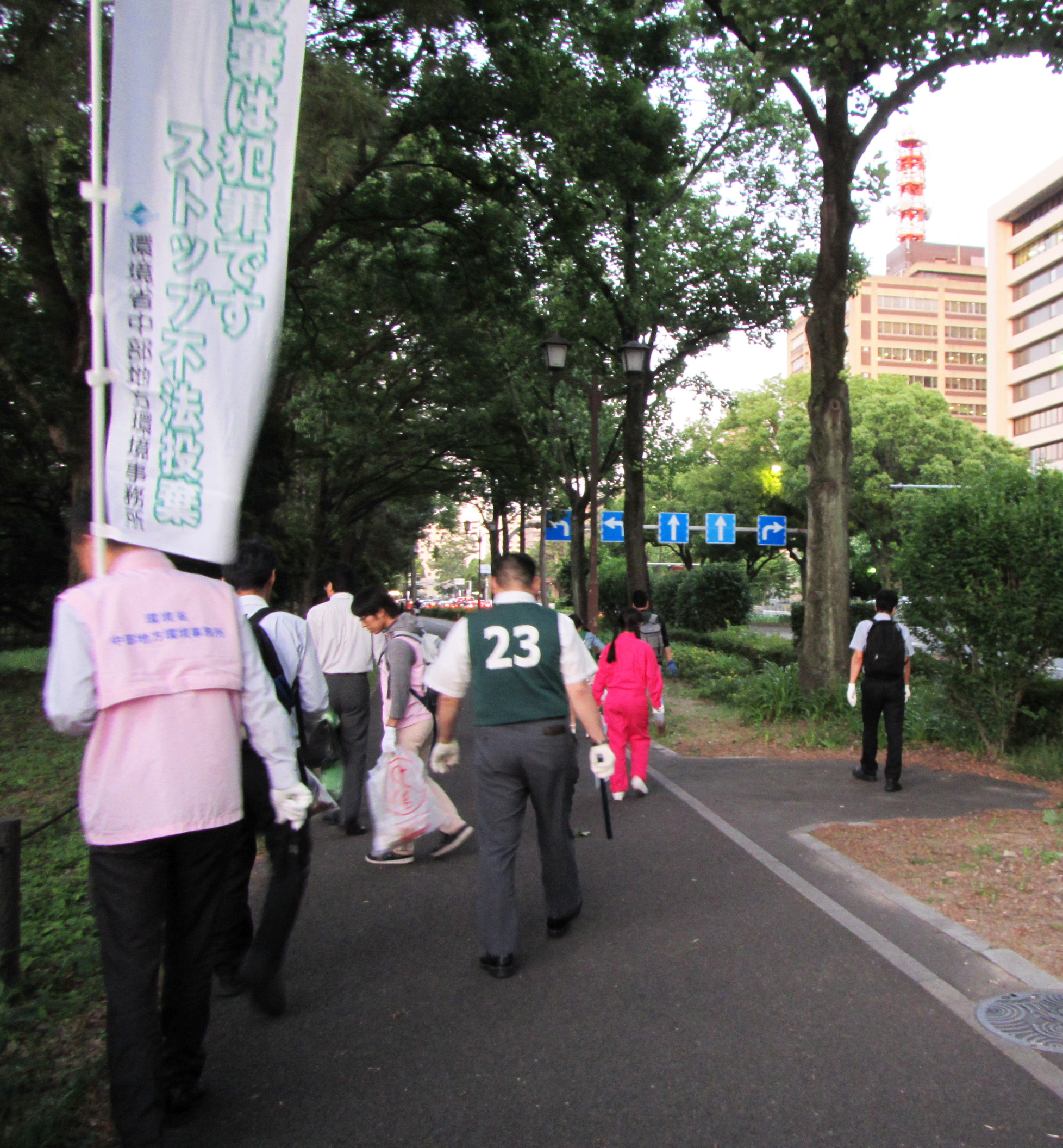 中部地方環境事務所では、全国ごみ不法投棄監視ウィークの取組の一環として、平成28年6月1日(水)に、名古屋市の協力を得て、中部地方不法投棄対策連絡会の構成機関、特定非営利活動法人グリーンバード名古屋チーム及び、お掃除ユニット「名古屋CLEAR'S」と合同で「第2回名古屋城から栄方面合同クリーンアップ活動」を実施しました。