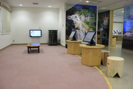 | 映像ホール(103インチモニター) | フリースペース(資料閲覧、検索コーナー) |