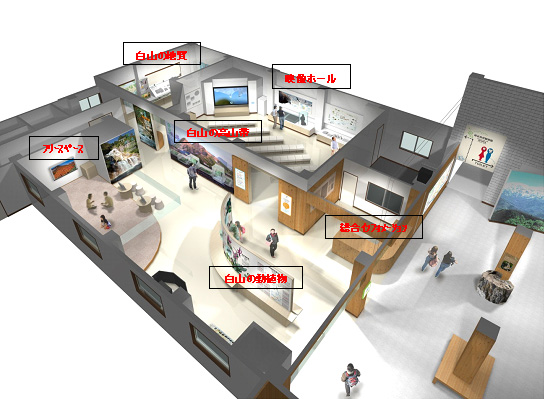 昭和47年に白山国立公園の総合案内施設として整備され、その後中宮展示館(石川県)の併設(平成10年)、展示施設の一部の改修(平成13年)を行い、白山を訪れる観光客に白山の自然や文化等伝える利用拠点として親しまれてきました。近年、生物多様性に対する関心の高まりや、外国からの観光客の増加、多様な利用者層への対応が求められるようになり、平成23年度に展示施設の更新や多言語化対応等の改修工事を行いました。