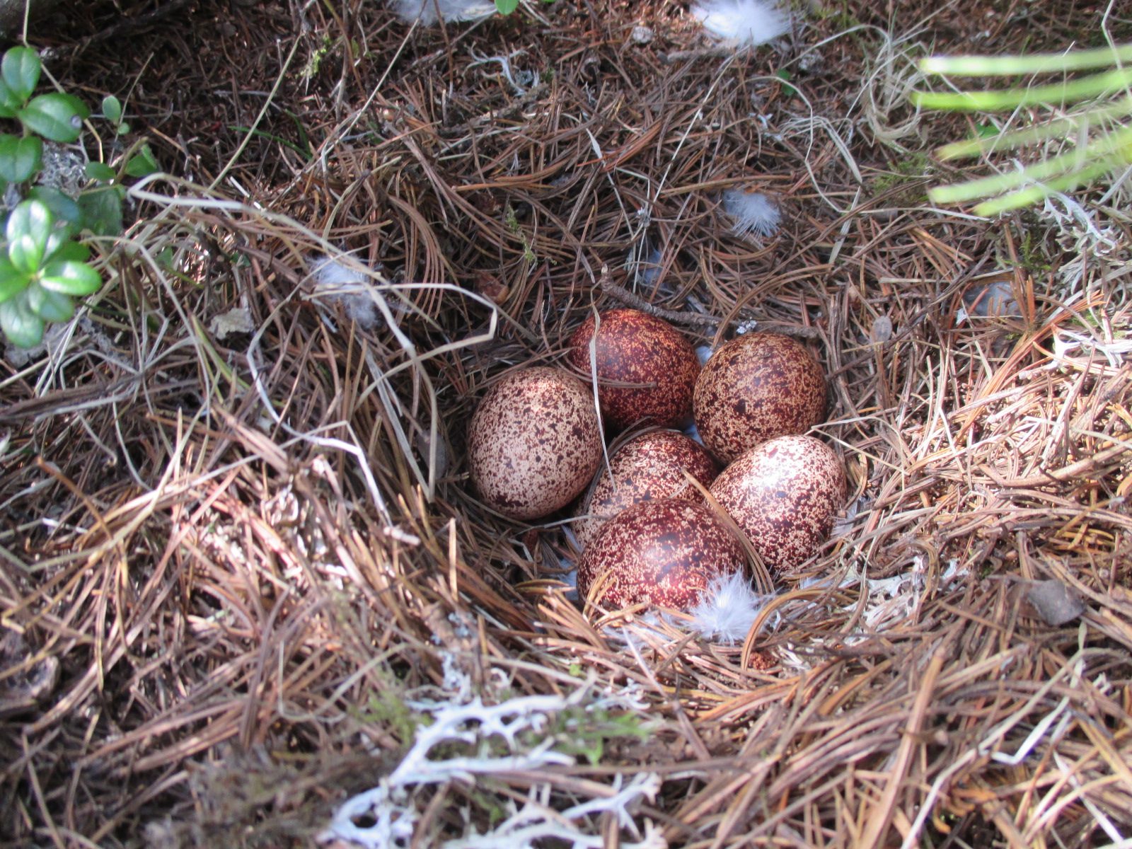 - 立山ではハシブトガラスがライチョウの巣を襲い卵を外に持ち出すことが富山雷鳥研究会で報告されています(松田2002)。ハシブトガラスによるライチョウの卵の捕食が確認されたのは今回で2例目になります。