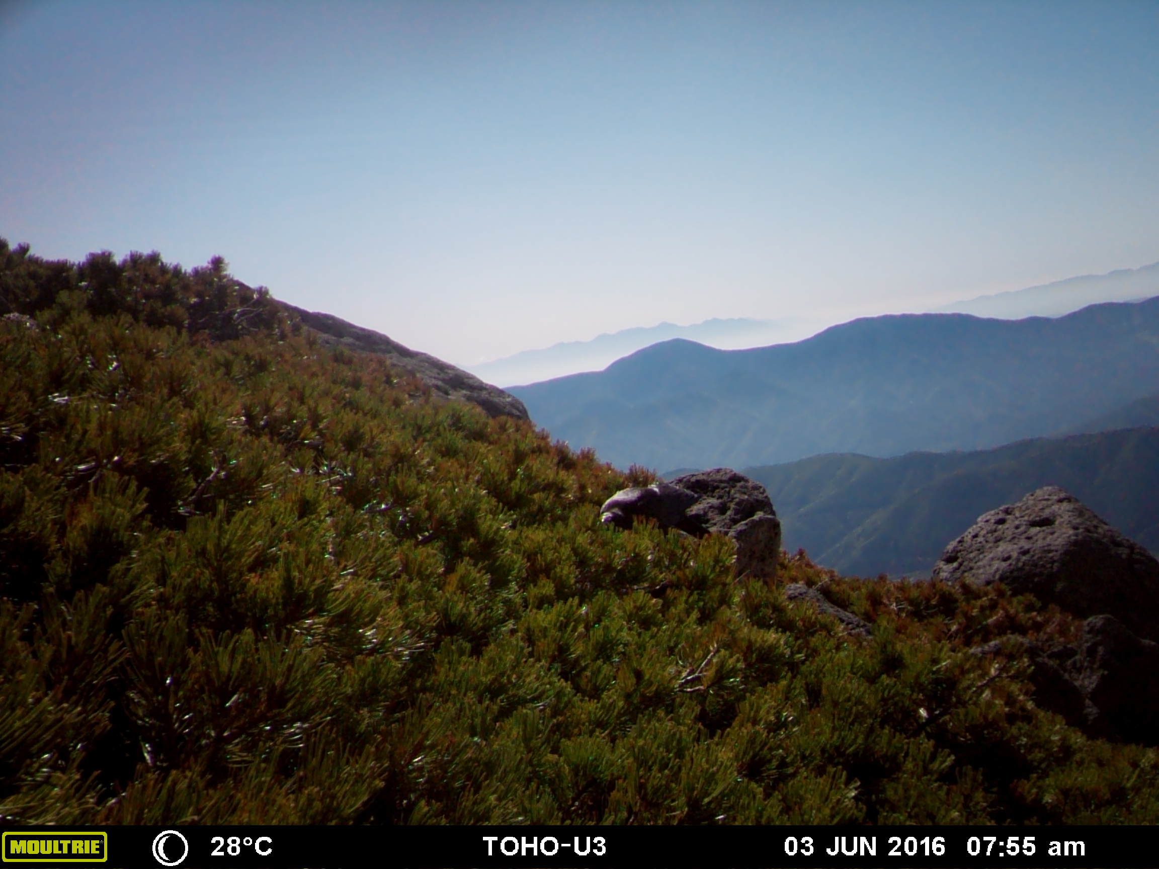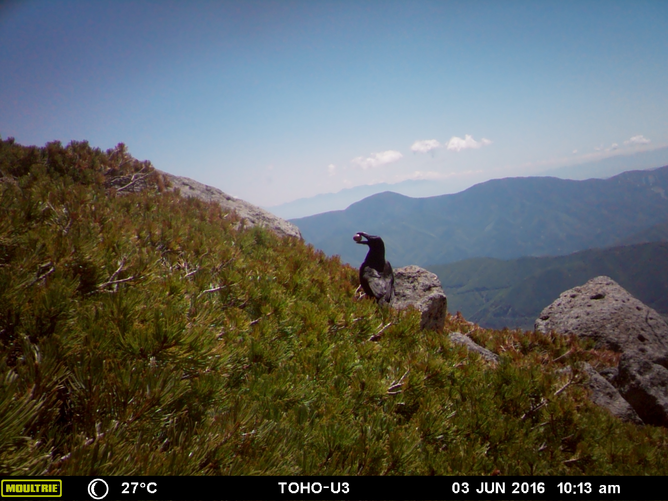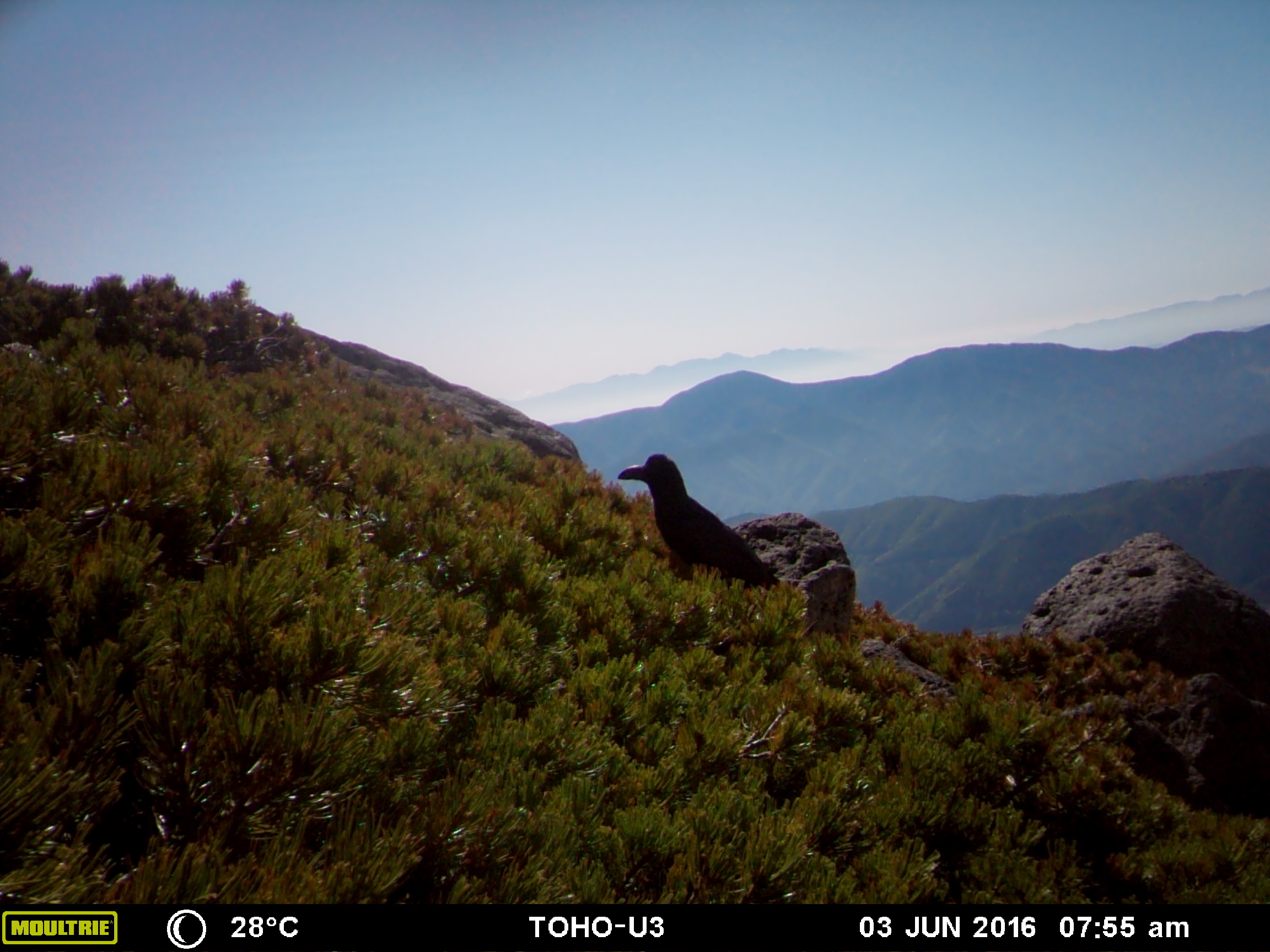 1930年代は標高2,400m以上の本州中部の高山帯でのカラスの確認はなく、1970年代でまれに高山でカラスが確認されるようになりました。乗鞍岳は1980年代頃にハシブトガラスが2羽程度観察されるようになりました。5月下旬から6月上旬に実施された平成28年度のファウンダー確保事業の調査中にも、日中に2羽程度のカラスが常時確認されていました。