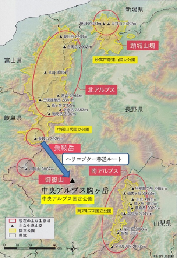 図1.ライチョウが生息する主な山岳及びヘリコプター移送ルート