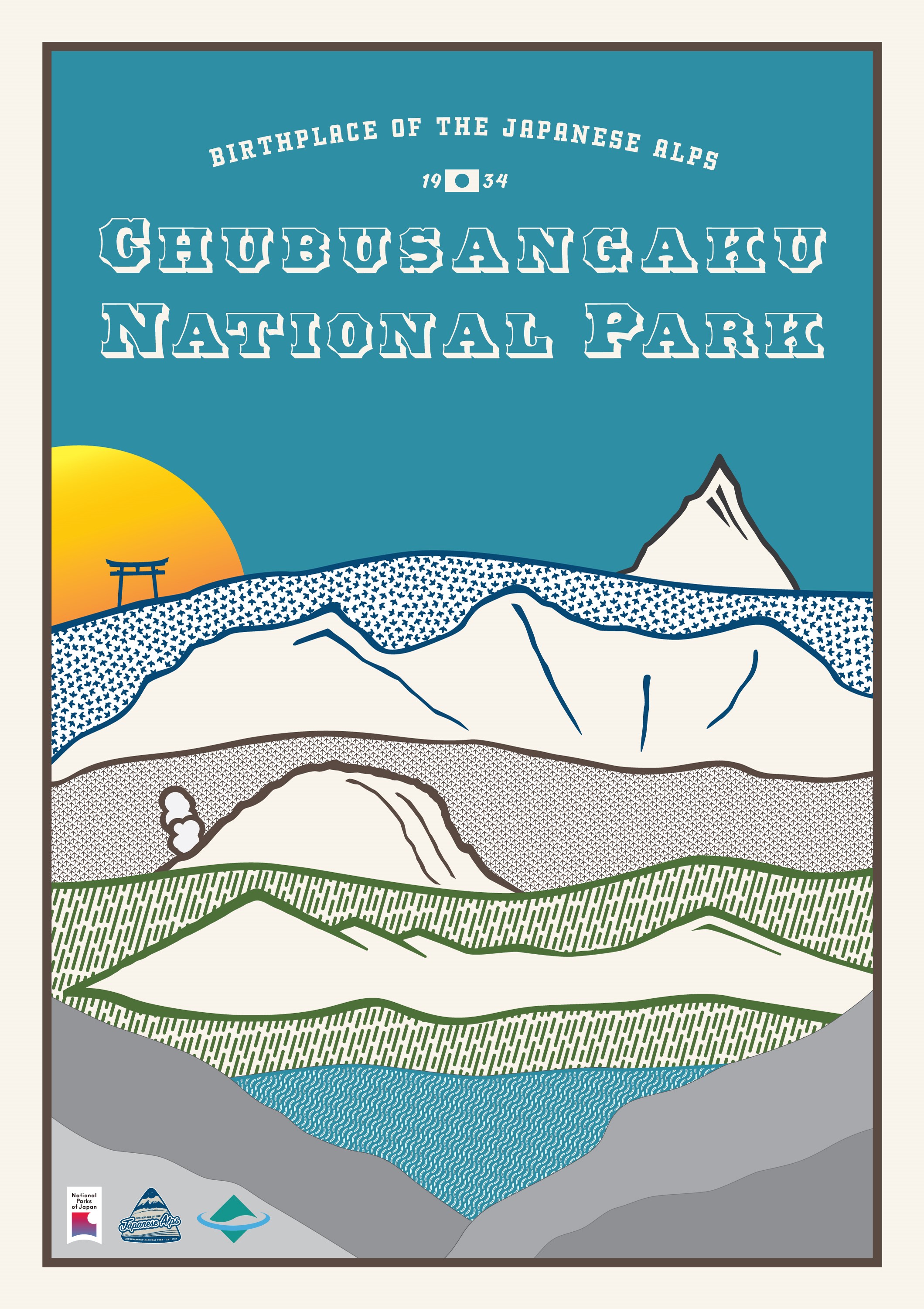 どこか懐かしさを感じられるようなノスタルジックなデザインを採用しました。最奥には槍ヶ岳を配置し、順に穂高連峰、焼岳、乗鞍岳等をイメージした山々により、中部山岳国立公園の奥行と重なりを表現しています。さらに山肌や水面のテクスチャには伝統的な木版画/刺し子のスタイルを用いています。また、高山から松本までの間に位置する中部山岳国立公園南部地域には1枚のポスターでは表現しきれないほどの多種多様な魅力があり、その全てをデザインとして採用することはできませんでしたが、このエリアの特徴を端的に表現するため、いくつかの工夫を凝らしています。例えば、テクスチャとして、槍ヶ岳と穂高連峰の間の空間には白樺のタネを散りばめたり、また、穂高連峰と焼岳の間の空間にはライチョウの足跡を表現しています。また、日の出や日の入り時は、中部山岳国立公園の景観が最も印象的に輝く時間帯であり、山と人との関わりによる文化や歴史の表現として、日の光に浮かび上がる鳥居のシルエットを盛り込んでいます。さらに、焼岳をイメージした茶色の山の脇からは、自然に湧出する温泉の湯けむりを見せています。ご覧になられる方が、これらにより、日本の国立公園の特徴であり、中部山岳国立公園が持つ、自然と文化の多様性を感じていただけると幸いです。