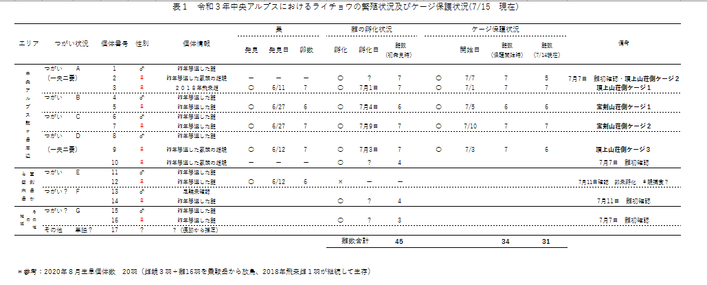 本年度は約50年ぶりに中央アルプスでの自然繁殖が確認され、7月5日までに中央アルプス駒ケ岳周辺で孵化した3家族についてケージ保護を開始していました。