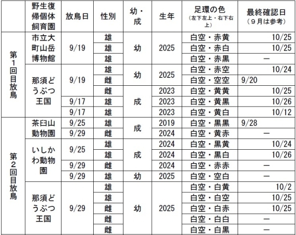 9月に放鳥した野生復帰個体の生存状況について、10月及び11月に週1回程度の頻度で事後調査を実施したところ、合計19羽の放鳥個体のうち、11個体が確認されました。