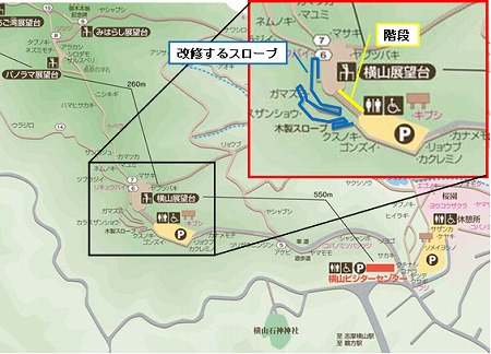 工事期間中は>スロープの通行ができなくなります。展望台下の駐車場から横山展望台へ行くには階段をご利用いただくことになります。利用者の皆様にはご不便とご迷惑をおかけしますが、ご理解とご協力をお願い申し上げます。