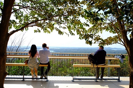 10分ほどの自然散策の後、階段を上ると開放感あふれるテラスが広がり、養殖筏など里海の景観が一望できます。標高170mのテラスでそよ風を感じながら、お弁当を楽しむこともできます。
