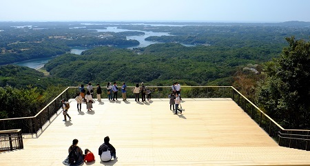 横山展望台からは、多数の島々やリアス海岸である英虞湾の自然景観と、真珠等の養殖筏に象徴される文化景観があわさってつくりだされる、自然と人々の営みが調和した里海の美しい風景が展望できます。