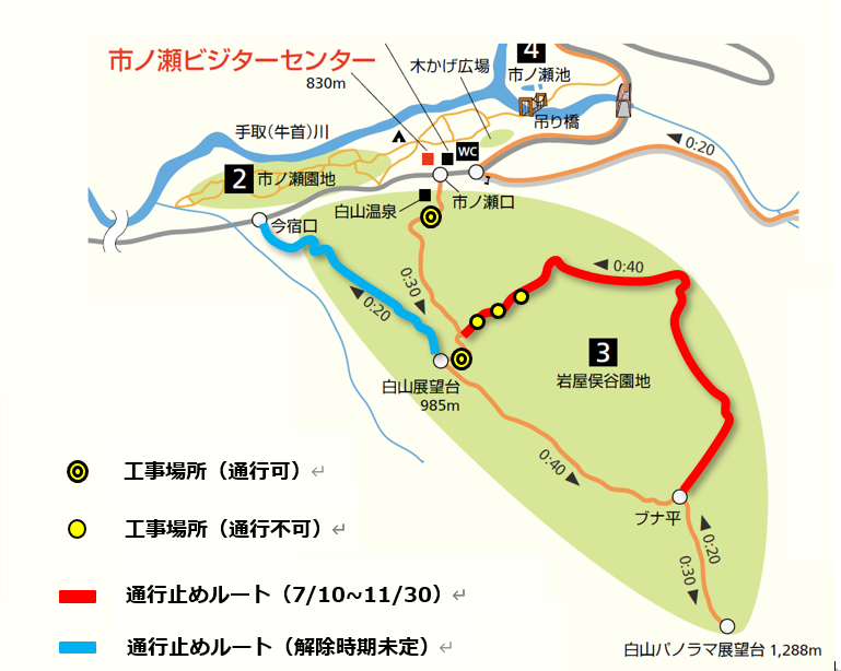 工事期間中も白山展望台や白山パノラマ展望台まで通行いただけますが、一部の登山道ルートの通行ができなくなります。
