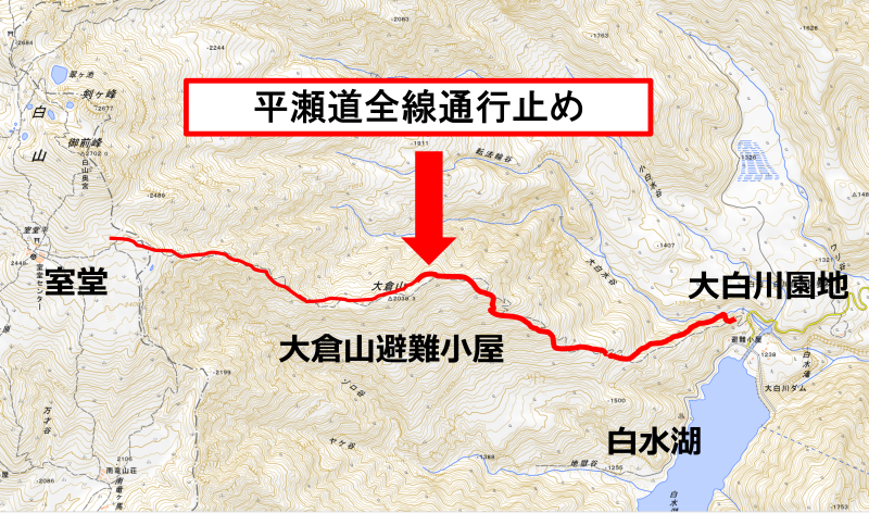 白山大白川線歩道(通称:平瀬道)は、登山道崩れ及び登山口へのアクセス道(県道451号白山公園線)通行止めのため、通行止めを実施します。