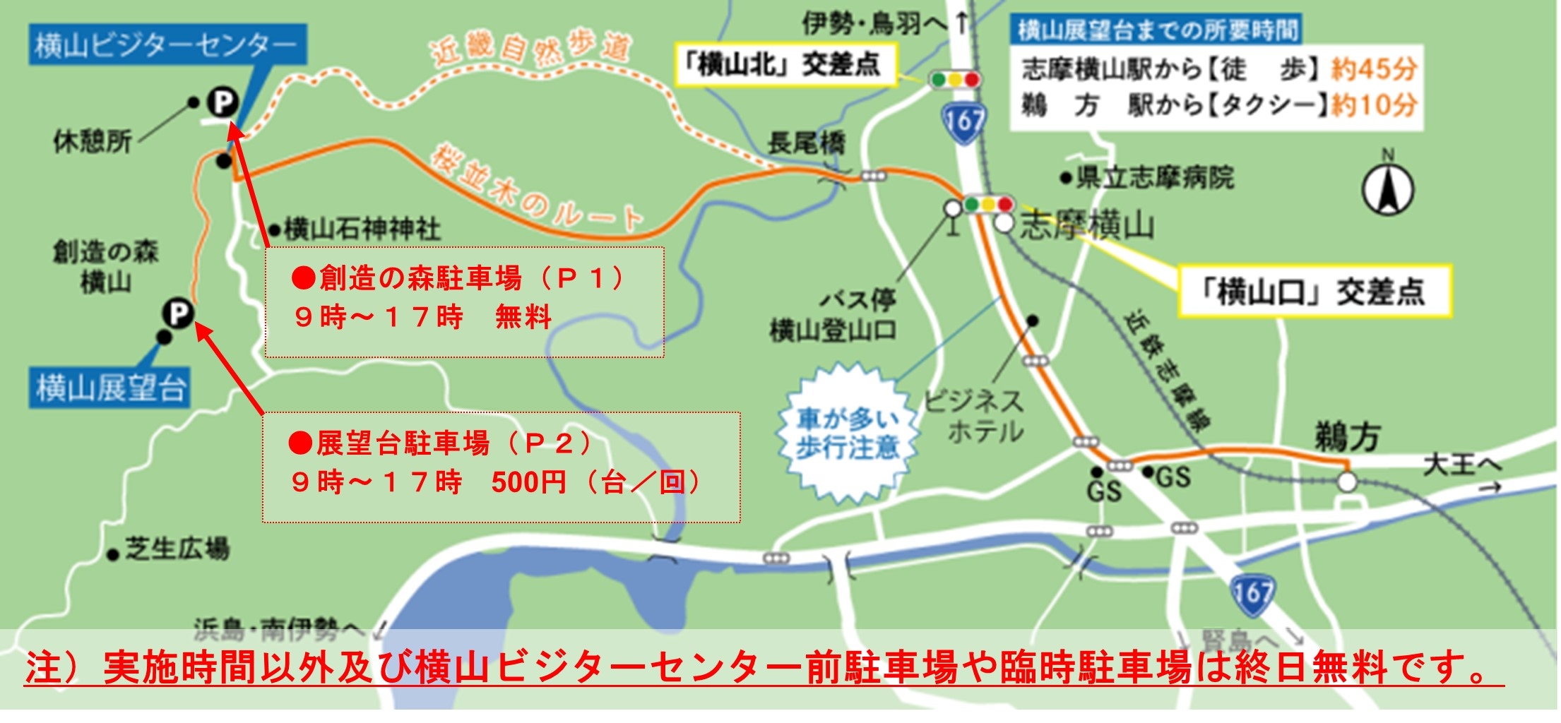 横山展望台は、年間30万人以上の来訪者により駐車場の渋滞が発生し、施設の安全で快適な利用に問題が発生しています。このため、自然環境の保全を図るとともに施設を利用される方が安全で快適に英虞湾を一望する景色を楽しむことができ、かつ持続性のある駐車場のあり方について社会実験を行い、その実効性を検証します。 - 展望台駐車場の有料化