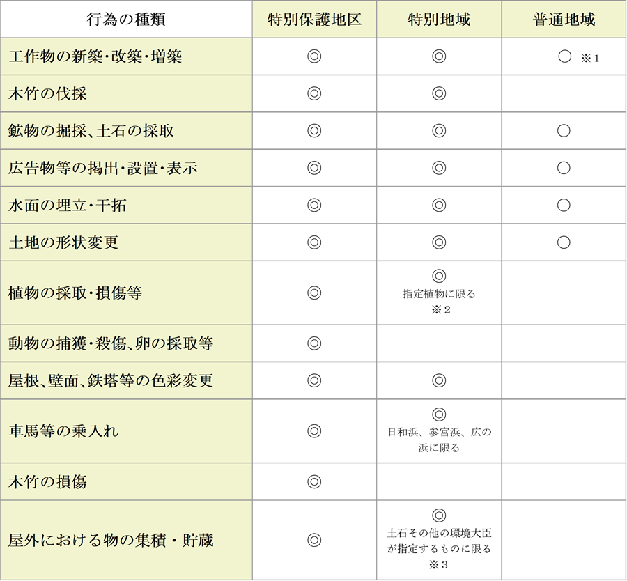 伊勢志摩国立公園の規制は、区域(特別保護地区、特別地域(第1種、第2種、第3種)及び普通地域)によってその規制の強さや手続きの方法が異なります。