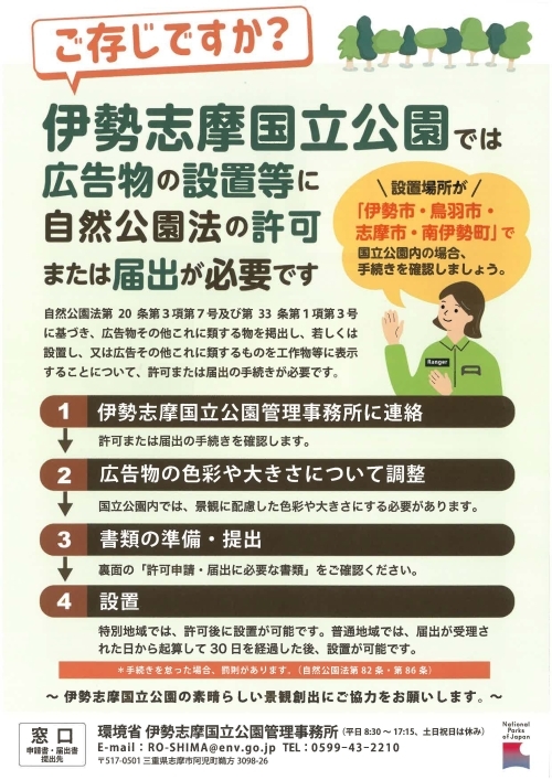 広告物の設置等を検討する場合は、まずは伊勢志摩国立公園管理事務所までご連絡ください。