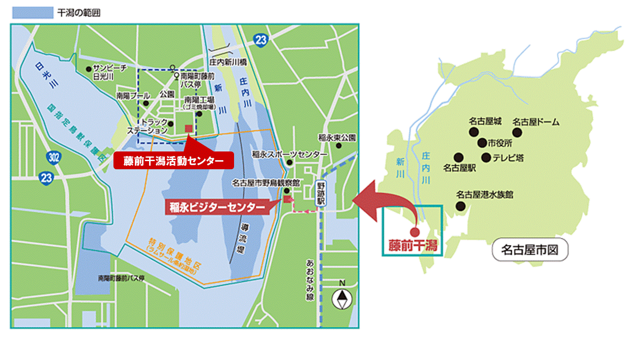 藤前干潟は伊勢湾最奥部に位置し、愛知県西部の庄内川、新川、日光川の3河川が合流する河口部に位置しています。