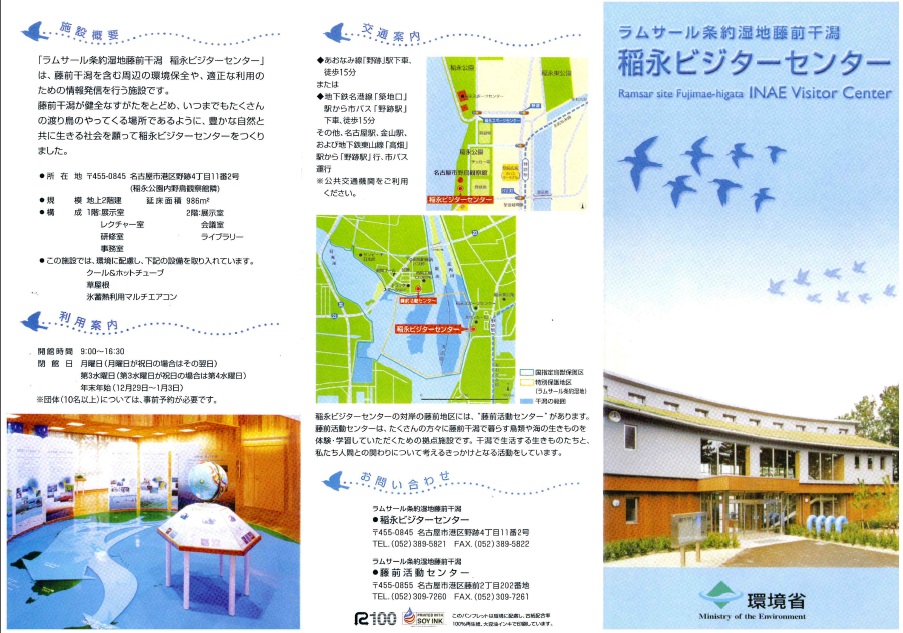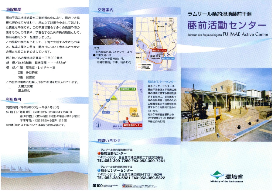2022年10月、藤前活動センターは、【藤前干潟活動センター】に名称変更されました。リンク先のパンフレットは藤前活動センターとなっておりますが、施設の概要や連絡先の変更はございません。